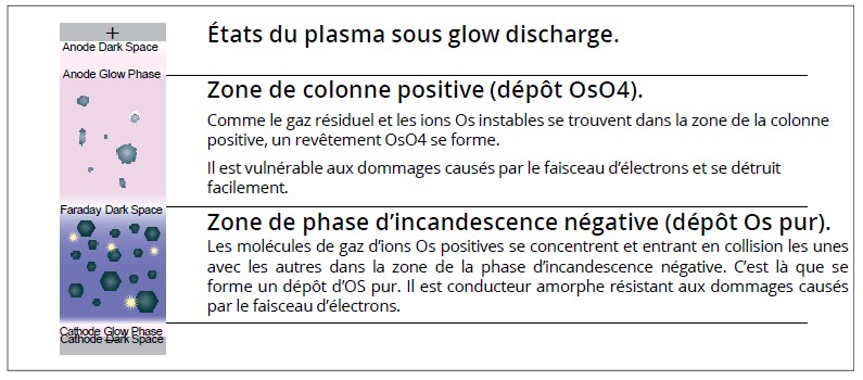 Grace au plasma CVD, le gaz de sublimation du tétraoxyde d’osmium est introduit dans la chambre à vide et le plasma est généré par un glow discharge. Au cours du procédé, la chambre est séparée en deux zones : « colonne positive » et « phase de d’incandescence négative ».